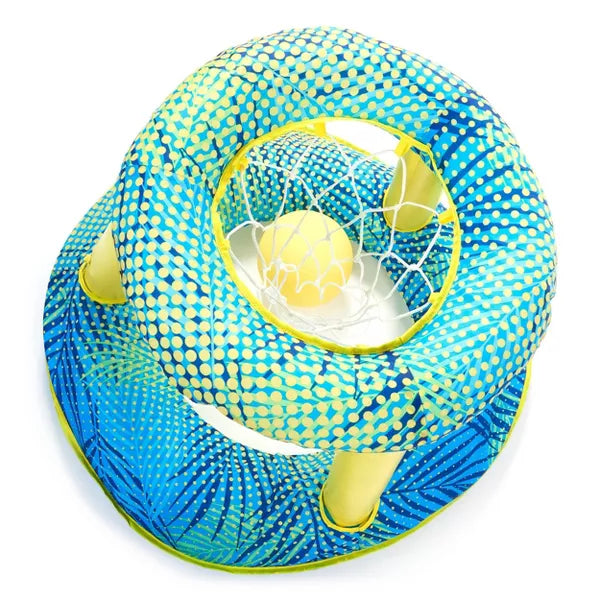 The Coop Hydro Spring Hoops is a floating basketball game set for the swimming pool! The floating net opens for instant action and easily closes for storage thanks to an inner spring in the base of the basket. The fabric covering on the goal features a brightly colored pattern that kids and teens love. This fabric cover also adds durability to the inflation chambers. Each basketball set includes an inflatable basketball with a textured grip for non-slip performance. Great for pool parties, endless summer days, and vacations. Folds flat and compact into three circles – it’s the perfect swimming pool game for travel! Includes one floating net and one ball per set. Carry/storage bag included. For children age 5 and up.